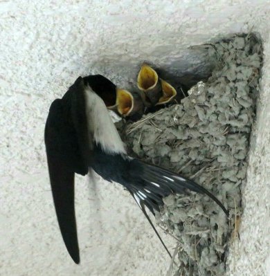 親達がエサを運び始めました。3羽顔をだしています。いや4羽確認できました。