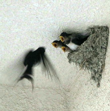 巣の周りをさらに騒がしく舞う親達以外のツバメが2ペアで4羽います。